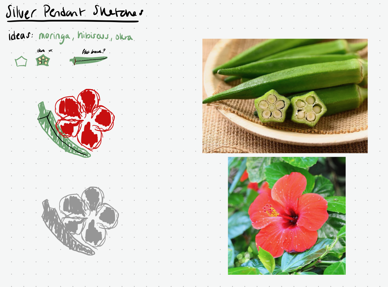 The design was inspired by my family and their Haitian heritage. My grandparents, in particular, had a strong connection to plants. My grandmother loved growing and cooking okra, and my grandfather has a stronginterest in herbalism and loved the hibiscus, Haiti’s national flower. These influences guided the direction of the piece, grounding the design in forms that reflect both personal and cultural significance. Intial sketches were to be simlified as I learned to make more organic structures in CAD, and the final design included only the okra.