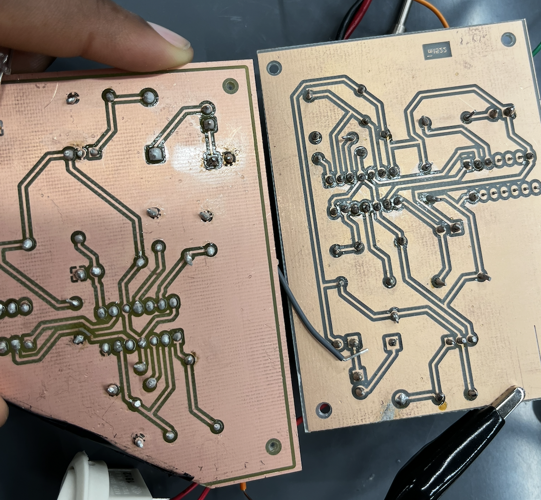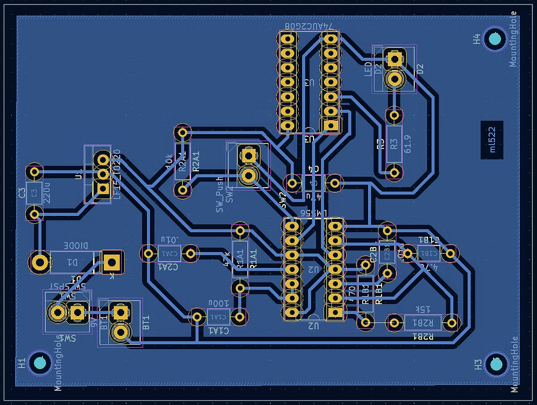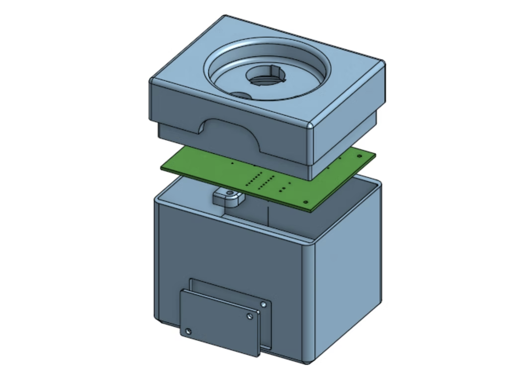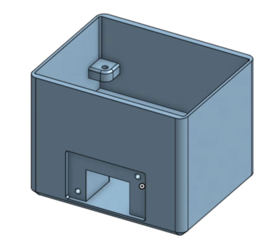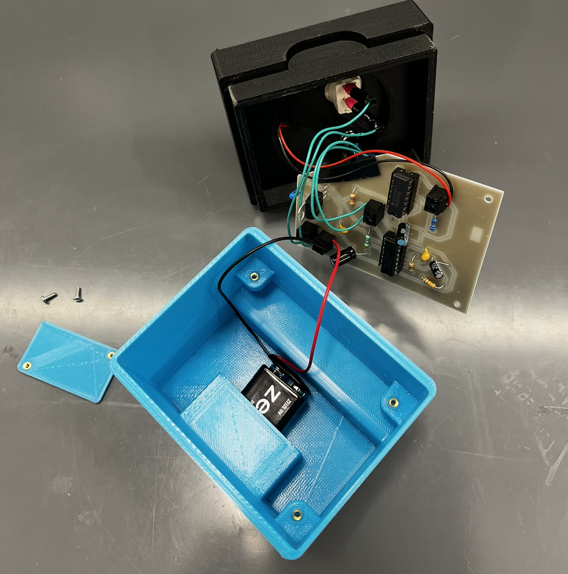 The box was 3D printed, sanded, and assembled. The PCB was designed in KiCad and milled and printed by course instructors. The first version had an oversized layout, incorrect socket footprint labels, and a missing ground fill, requiring a full redesign and re-mill. The second version was more compact and correctly labeled, and functioned as intended after minor corrections including manually bridging a ground trace to the copper fill. Components were soldered onto the board, and the enclosure was printed, sanded, and assembled with all hardware.