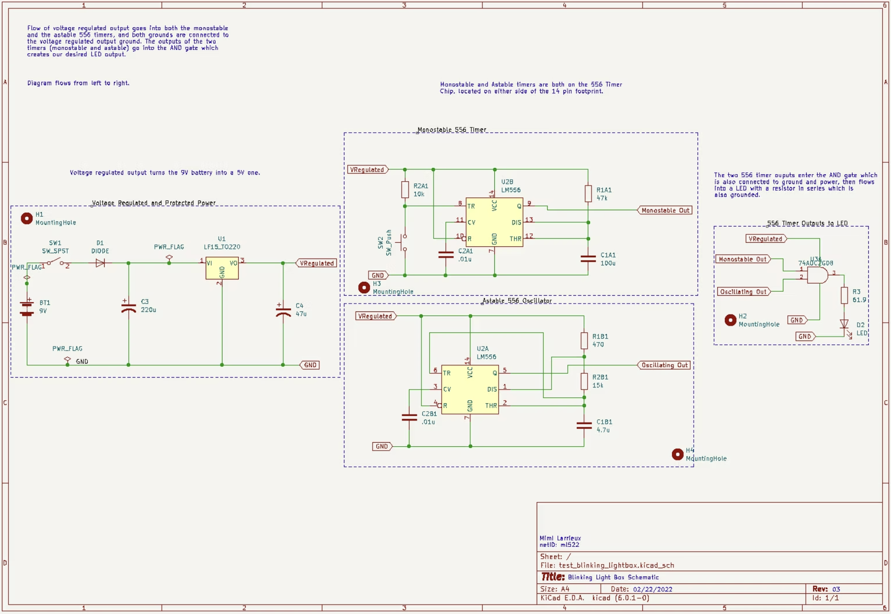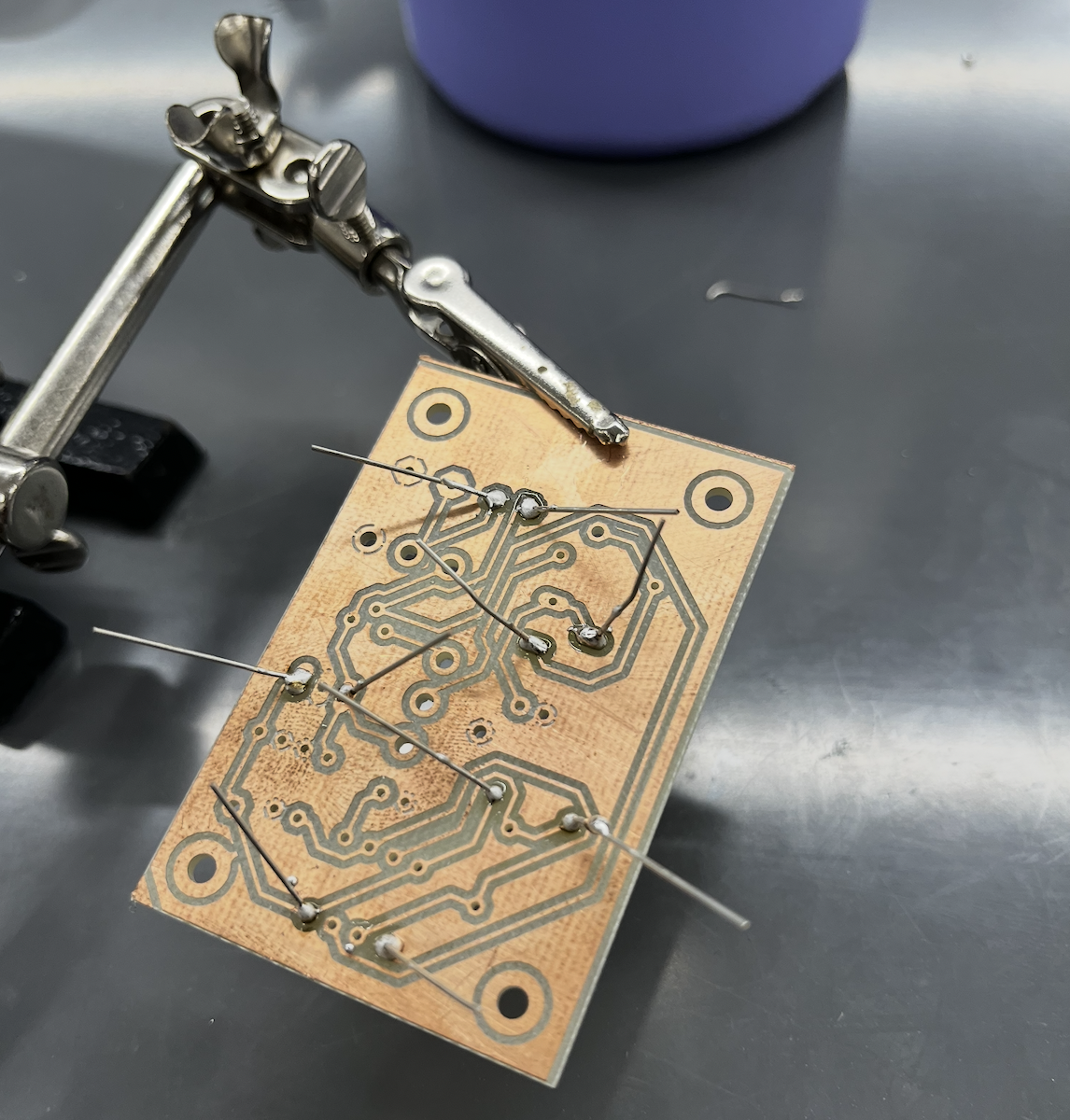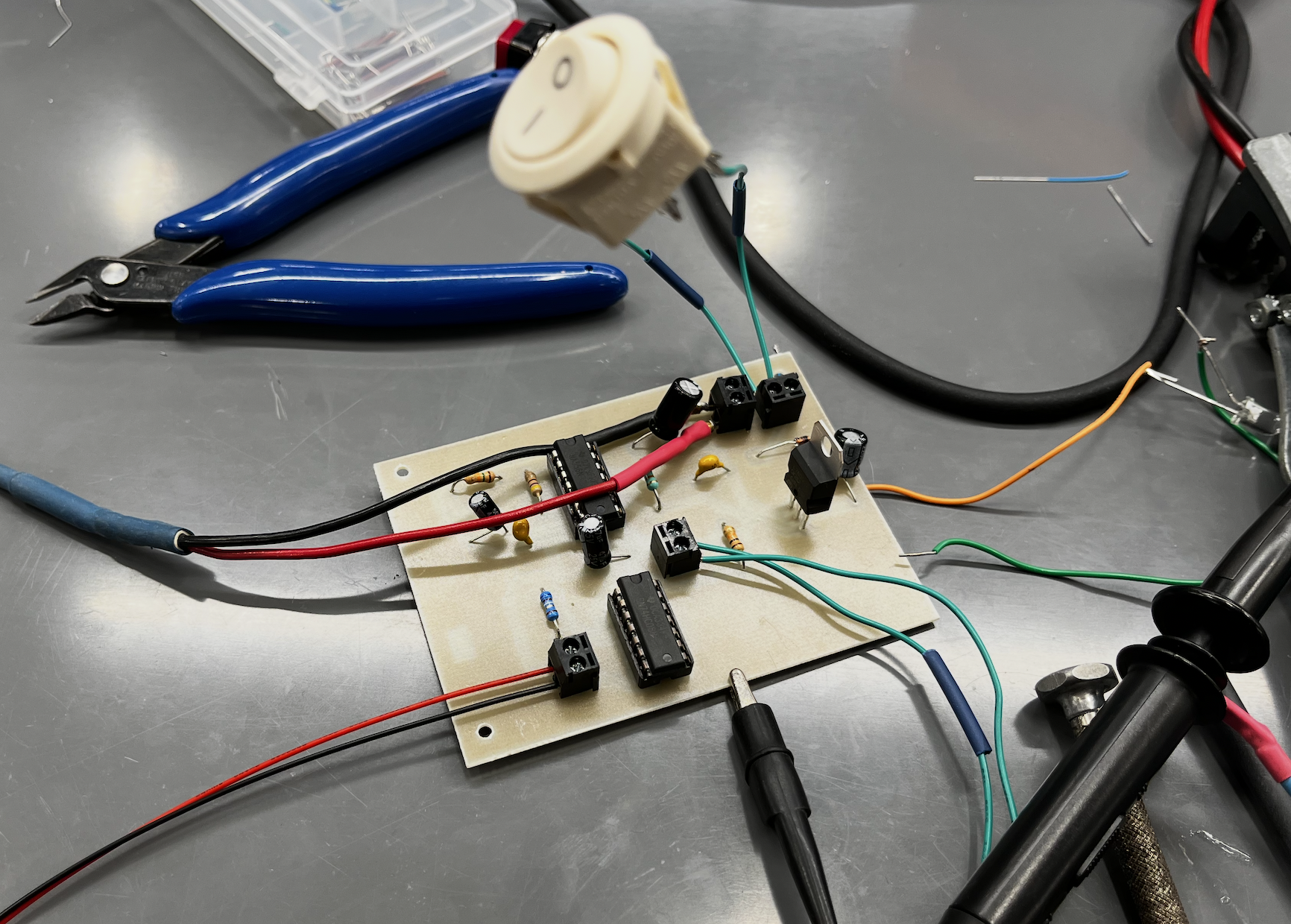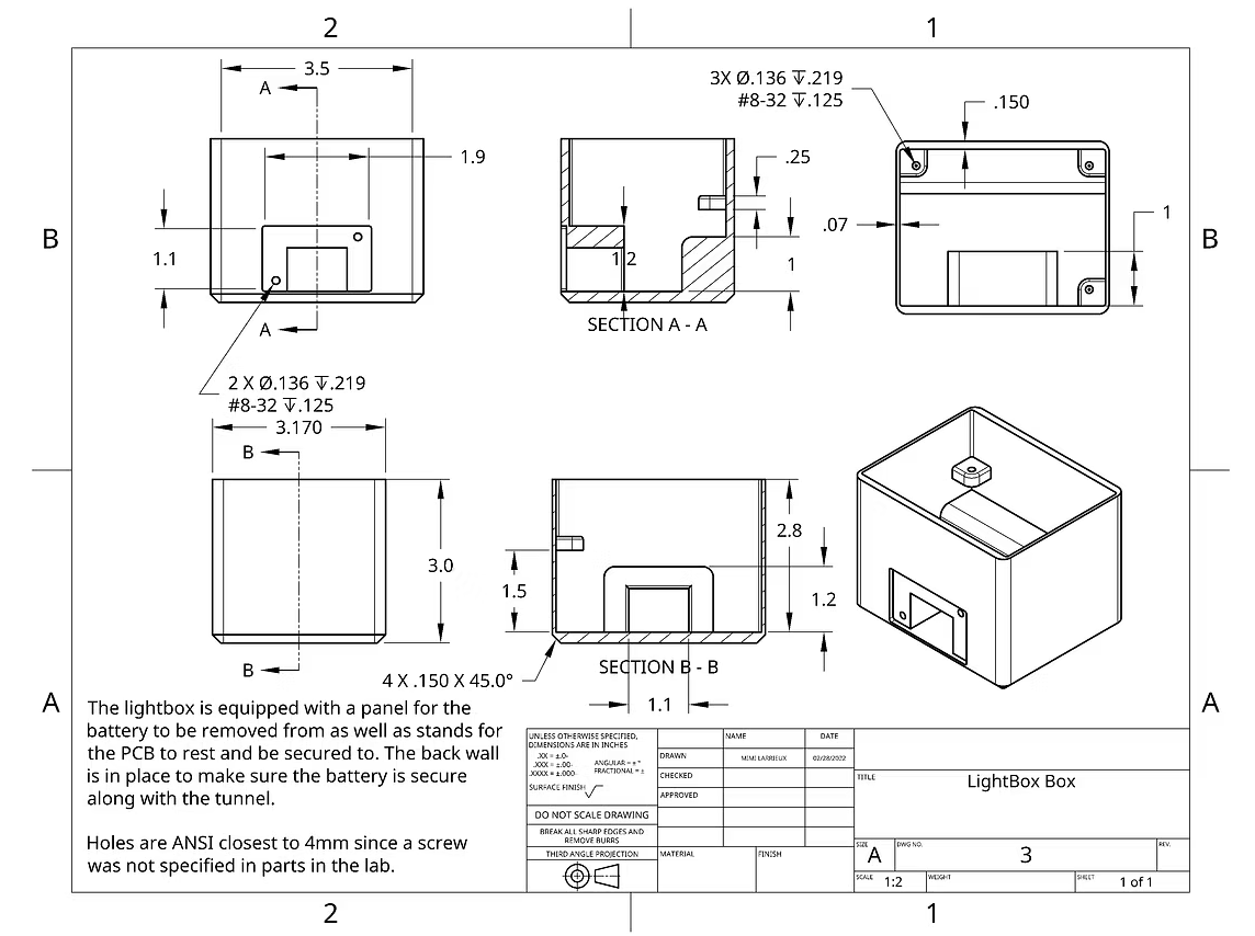 The box was 3D printed, sanded, and assembled. The PCB was designed in KiCad and milled and printed by course instructors. The first version had an oversized layout, incorrect socket footprint labels, and a missing ground fill, requiring a full redesign and re-mill. The second version was more compact and correctly labeled, and functioned as intended after minor corrections including manually bridging a ground trace to the copper fill. Components were soldered onto the board, and the enclosure was printed, sanded, and assembled with all hardware.