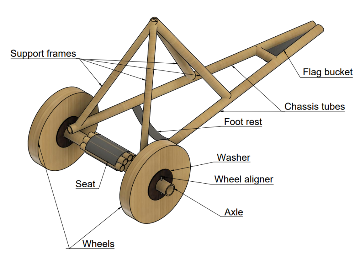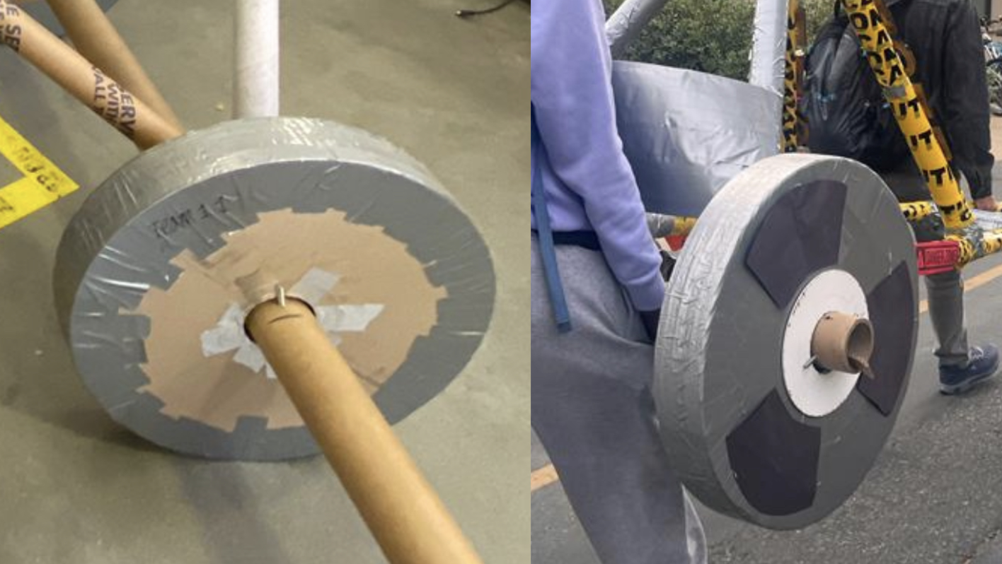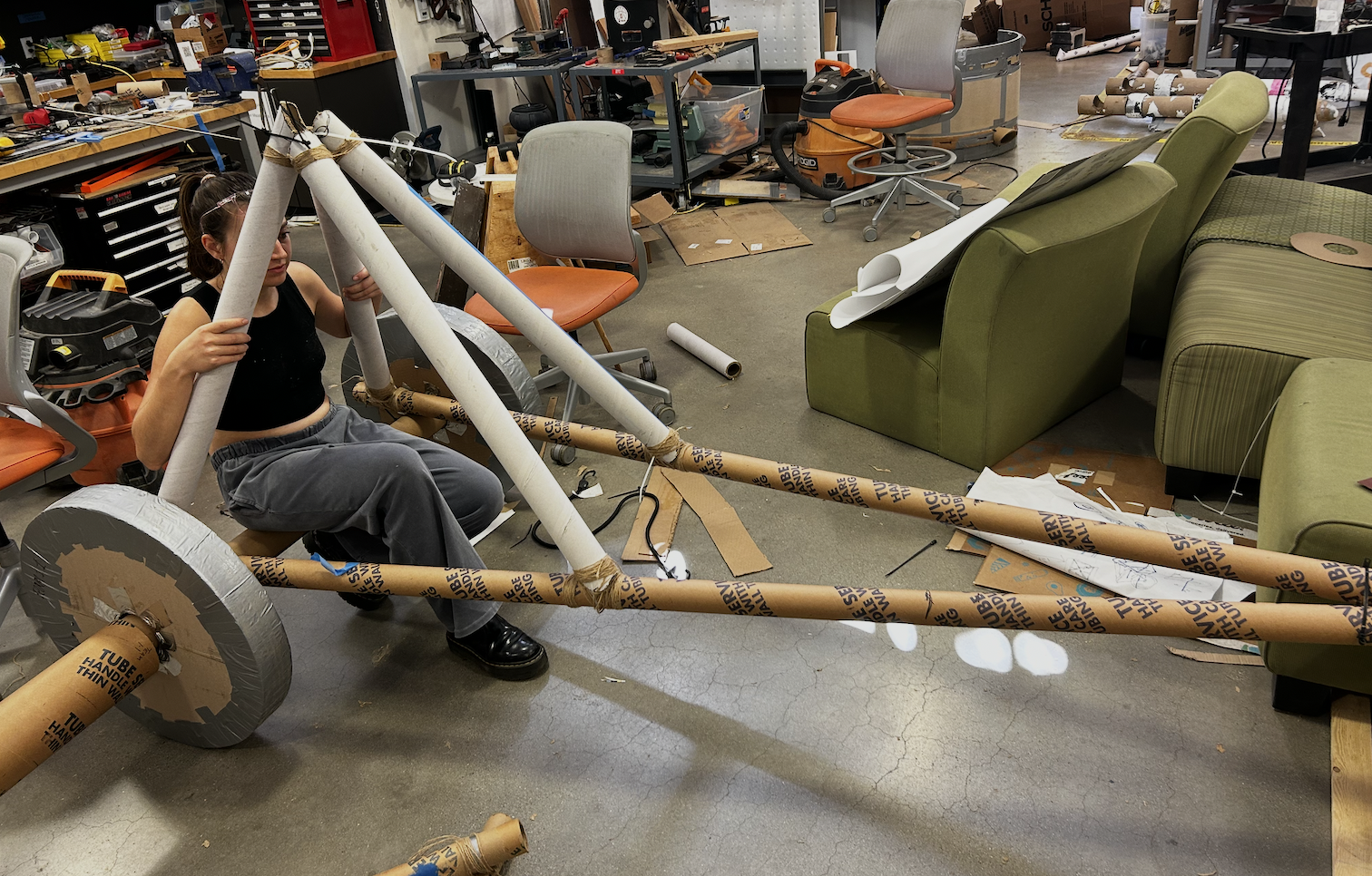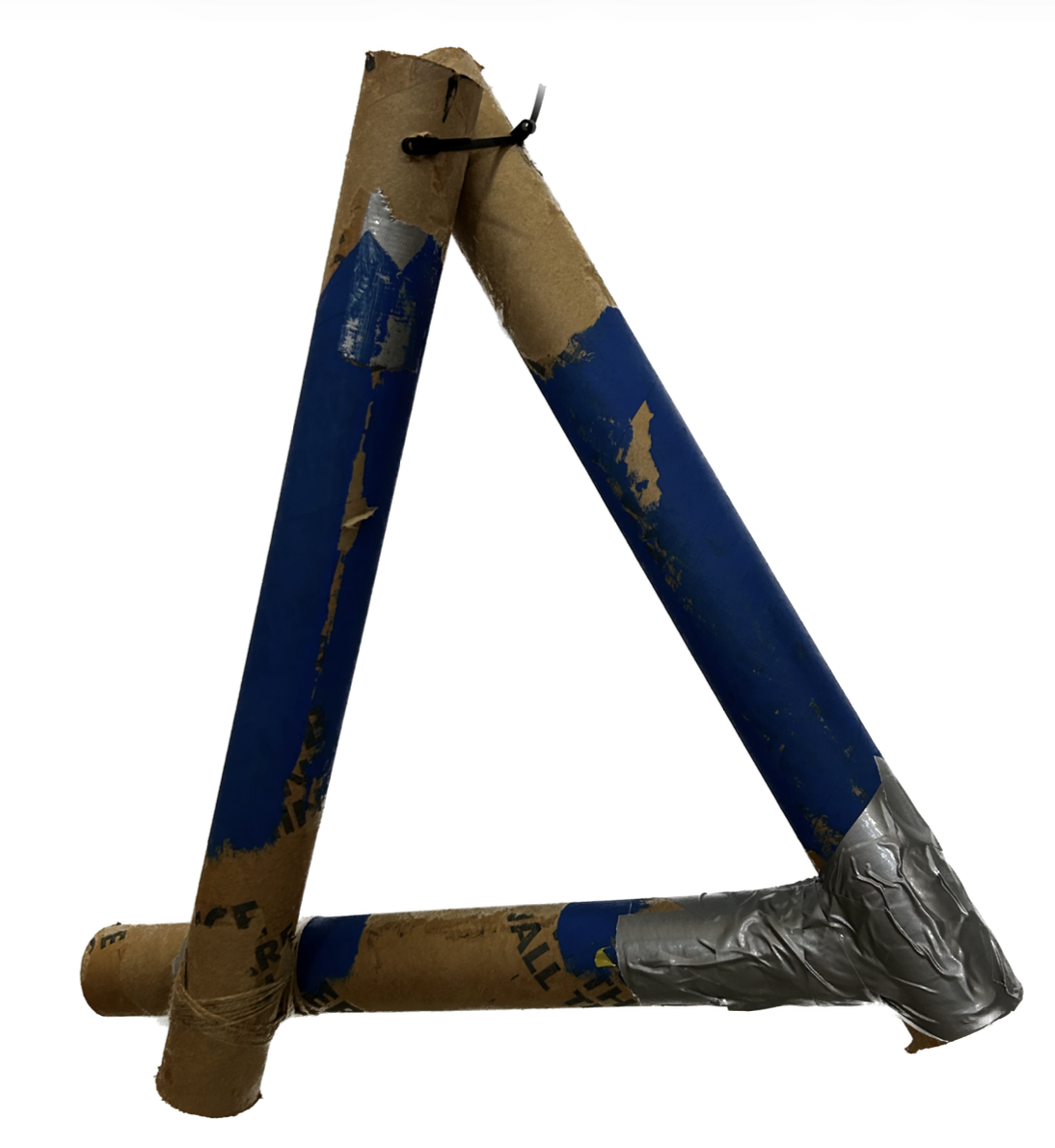 Materials were sourced entirely through scavenging, pulling cardboard boxes from bike shops, tubes from rug stores and fabric suppliers, and shared shop supplies. Wheels were laser-cut into semi-circles, layered 25 deep with offset seams, and wood-glued together. Frame joints used a four-step binding method: zip tie, lashing, wood glue, then duct tape, developed through systematic prototype testing of each method independently.