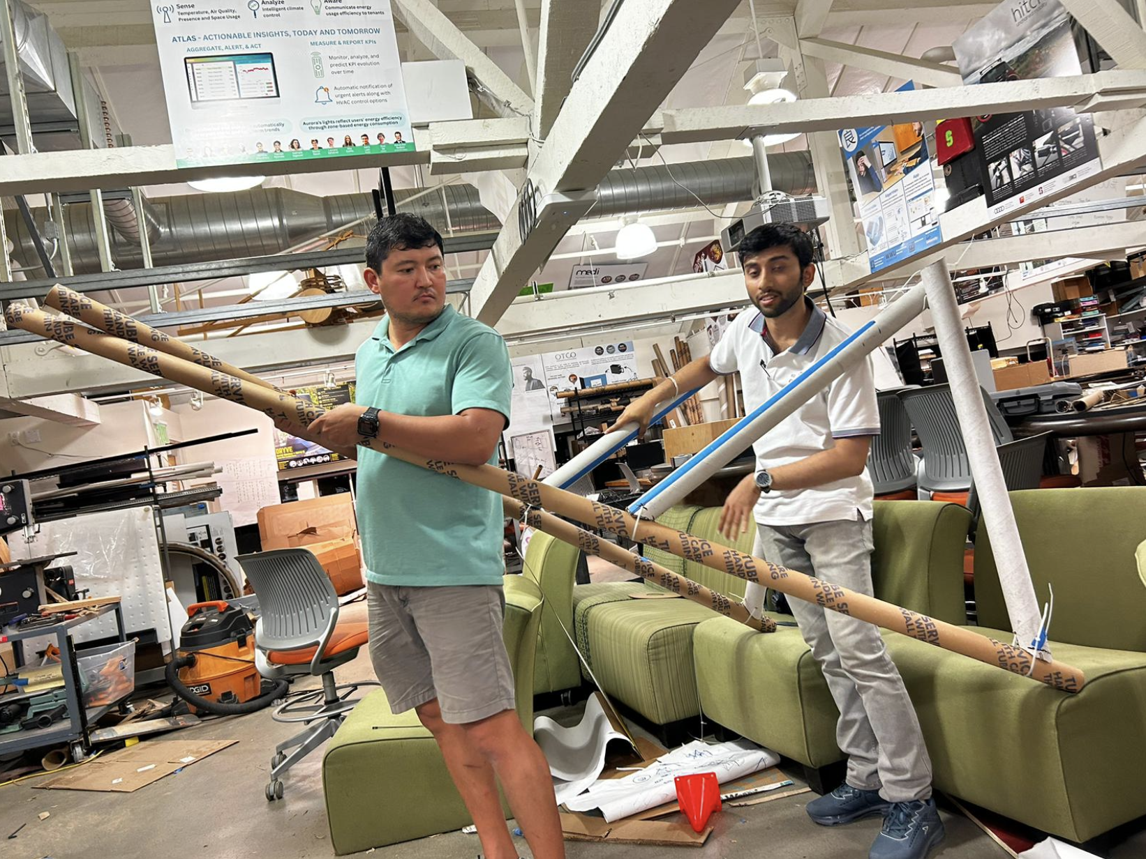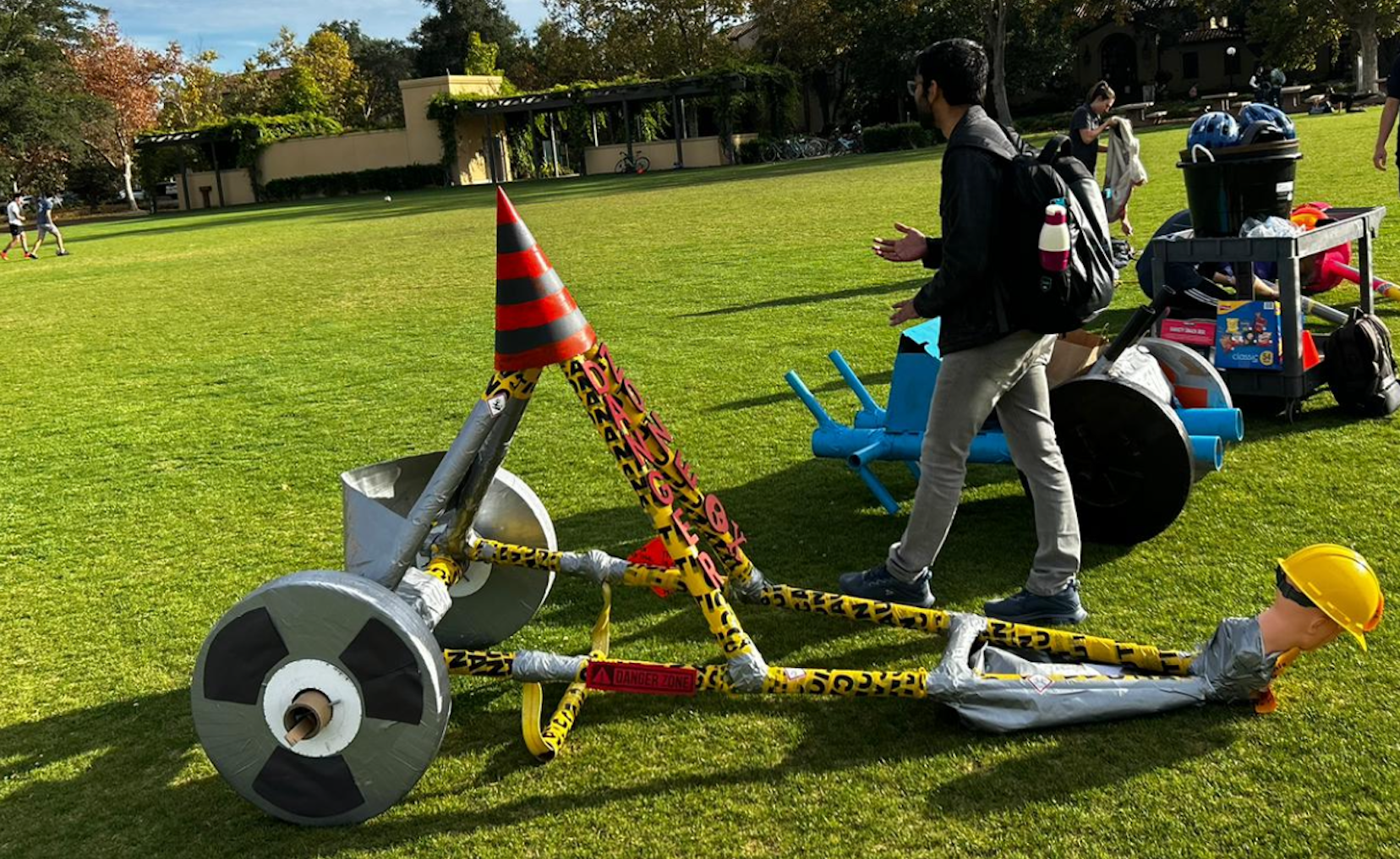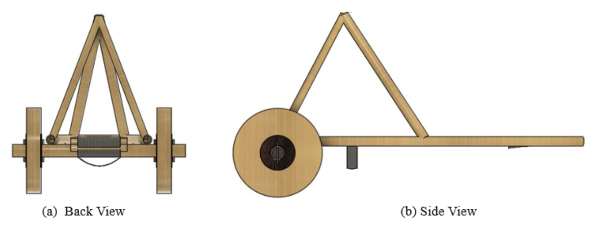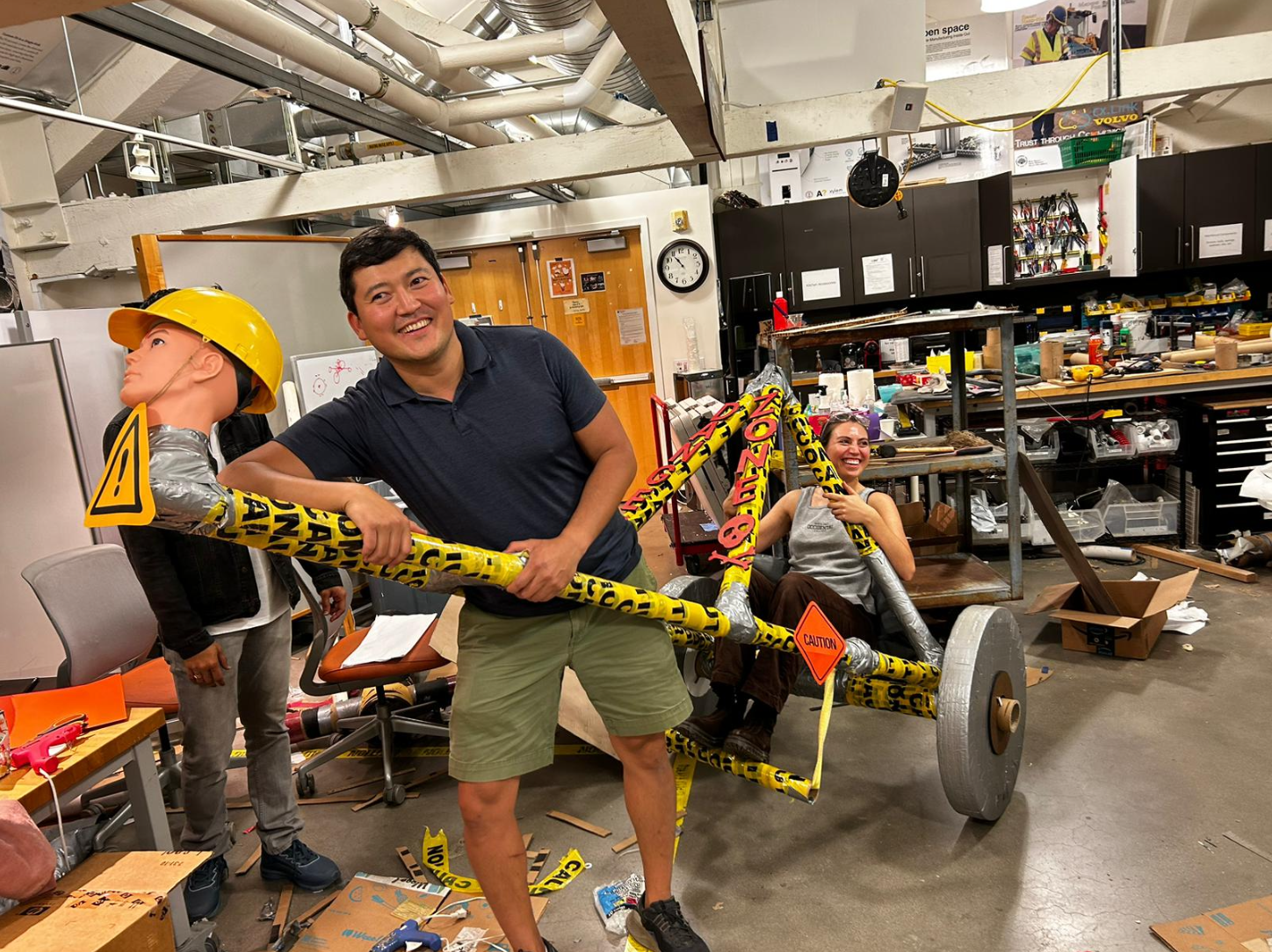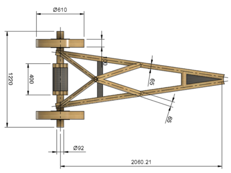 Materials were sourced entirely through scavenging, pulling cardboard boxes from bike shops, tubes from rug stores and fabric suppliers, and shared shop supplies. Wheels were laser-cut into semi-circles, layered 25 deep with offset seams, and wood-glued together. Frame joints used a four-step binding method: zip tie, lashing, wood glue, then duct tape, developed through systematic prototype testing of each method independently.
